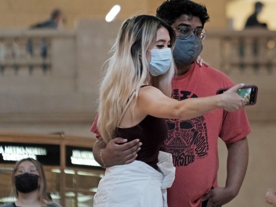 People wearing masks pose in Grand Central Terminal on July 27, 2021 in New York City. Due to the rapidly spreading Delta variant, the Centers for Disease Control and Prevention has recommended that fully vaccinated people begin wearing masks indoors again in places with high Covid-19 transmission rates. PHOTO BY SPENCER PLATT/GETTY IMAGES